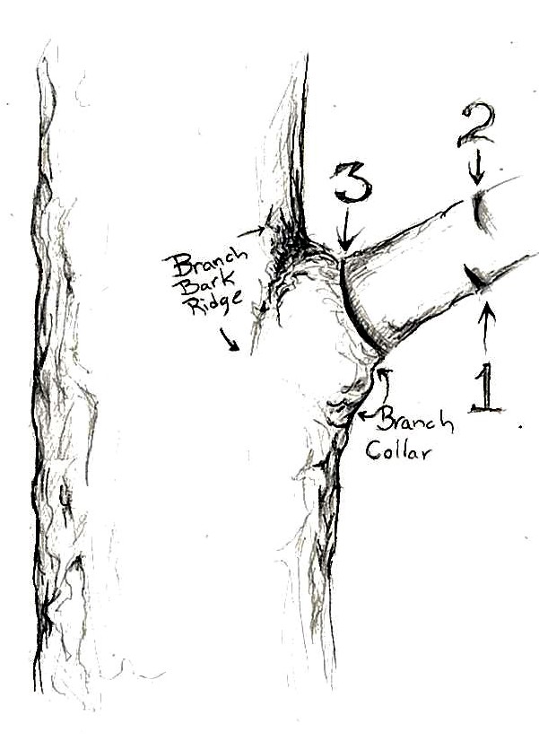 The last cut is the most important cut(3) as this is the one that determines the trees ability to “heal” from the damage from removing the branch. This last cut should be made at the branch collar.